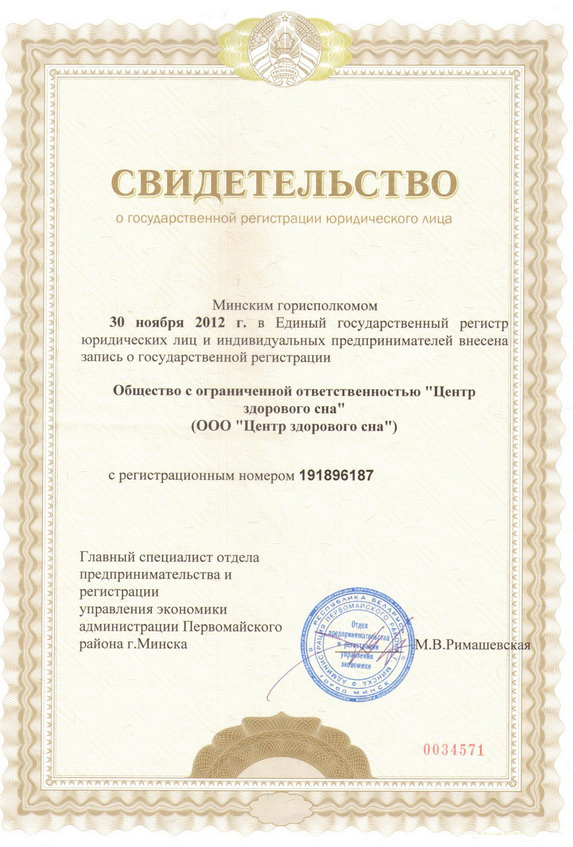 УНП: 191896187; свидетельство о гос. регистрации выдано Минским горисполкомом 26.11.2012 г.; лицензия на право осуществления медицинской деятельности М-7513. Дата принятия решения о выдаче лицензии: 24.04.2013